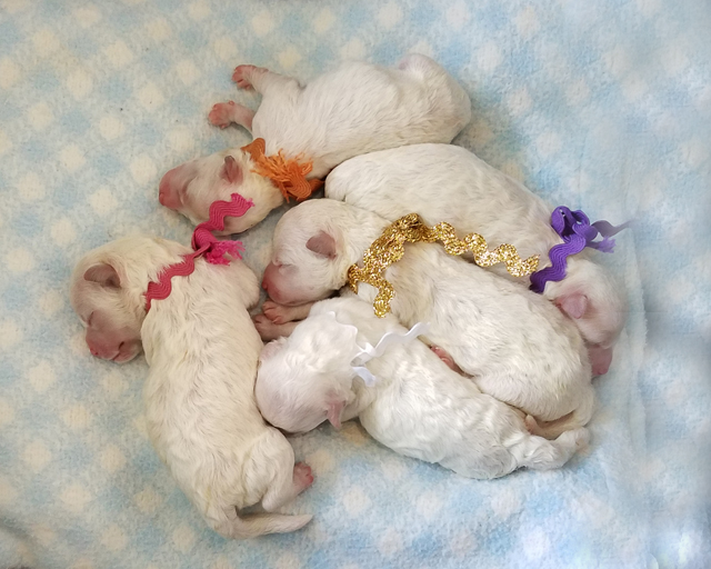 Monday morning Dee Dee was ready to deliver her babies, and she made it look easy, delivering 3 girls and 2 boys in less than 3 hours of labor. She and her puppies went to the vet for an initial wellness check which they passed with flying colors. You can see pictures and follow this litter’s development at the following link: