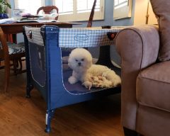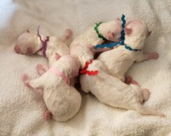 This year Hollyhock was represented at the Bichon Frise Club of San Diego’s 50th and 51st specialty shows by 8 year old IntCH GCH CH Hollyhock SHE Returns “Holly” and her son, 18 month old CH Hollyhock Alfa Romeo “Romeo”. It was a BIG show this year with nearly 50 entries and lots of tasks for Deb and Linda to tackle behind the scenes to make sure the event was a success. There wasn’t much time to show more dogs so we decided to focus on Holly and Romeo. They did not disappoint, with Holly taking Best Veteran Bitch in both shows and Romeo taking an Award of Merit up against some amazing specials, including the dog that won the breed at Westminster, “Donald”. We have high hopes for Romeo this year as he continues to mature in the show ring.