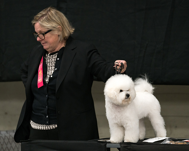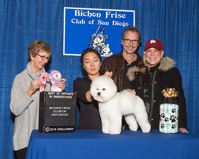 Congratulations to Hollyhock Alfa Romeo, “Romeo” for his awards during his conformation debut at the 2018 Bichon Frise Club of San Diego specialty shows. Having just turned 6 months old, Romeo did not seem rattled by all the commotion of the dog show. His family, Anne and Tony Platt, kept their distance as Haemi Choi groomed him and handled him in the ring. Rommy received wonderful comments from the judges and was awarded Best Opposite Puppy in Sweepstakes and in Conformation at both shows. Great start little man!
